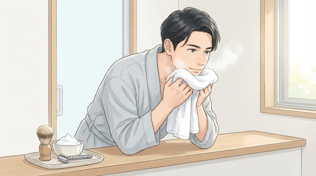 余分な皮脂や汚れを落とすことで、剃りやすくなり肌への負担も軽減されます。 - 蒸しタオルで肌を柔らかくする